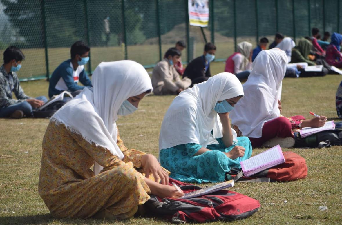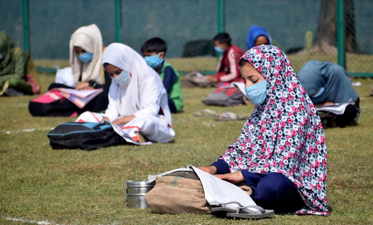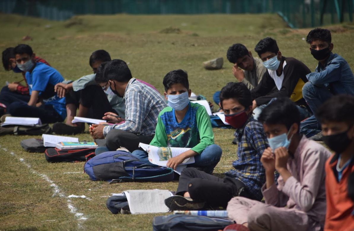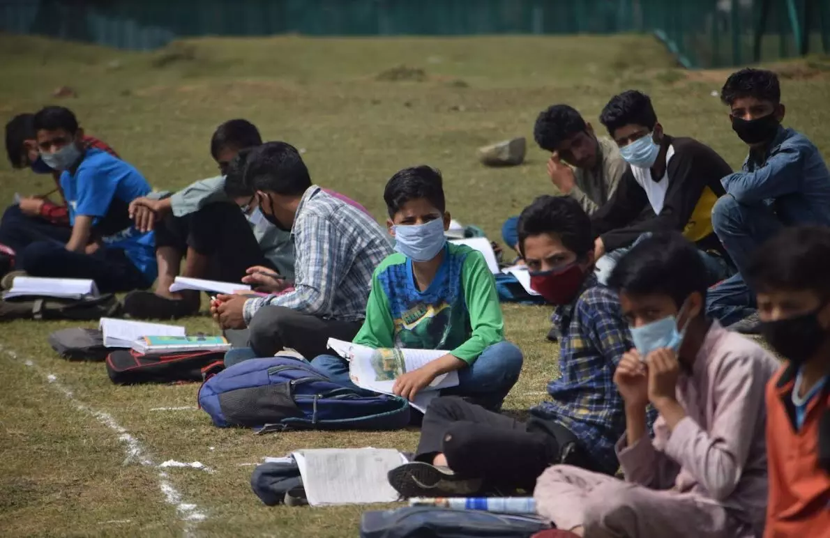 SRINAGAR: A remote village in central Kashmir's Budgam district has sought to break the Covid 19 logjam on schooling by starting an open air community school. Among the trees and clean air, over two dozen students sit cross-legged with their school bags serving as 'desks;. The teacher rely ona portable whiteboard for the lessons.