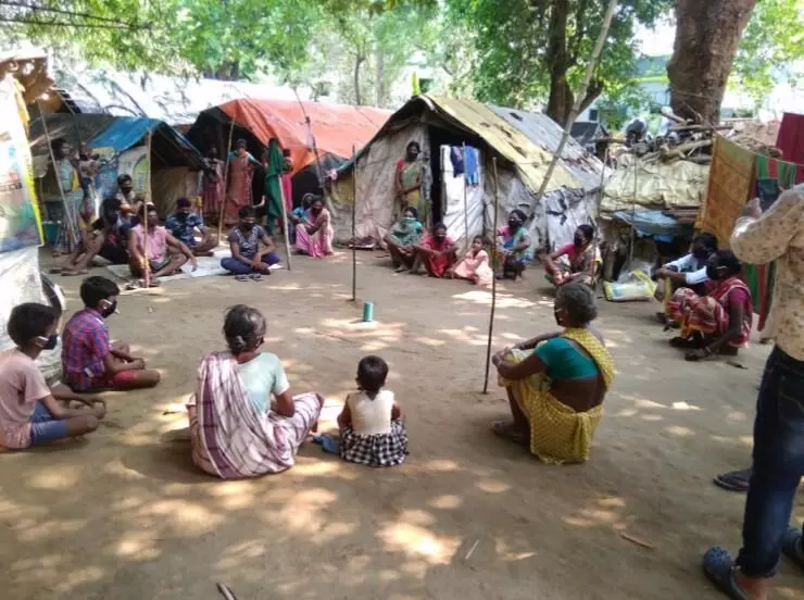 Radio Bulbul spreading awareness regarding the importance of masks among migrant laborers. Credit:Radio Bulbul