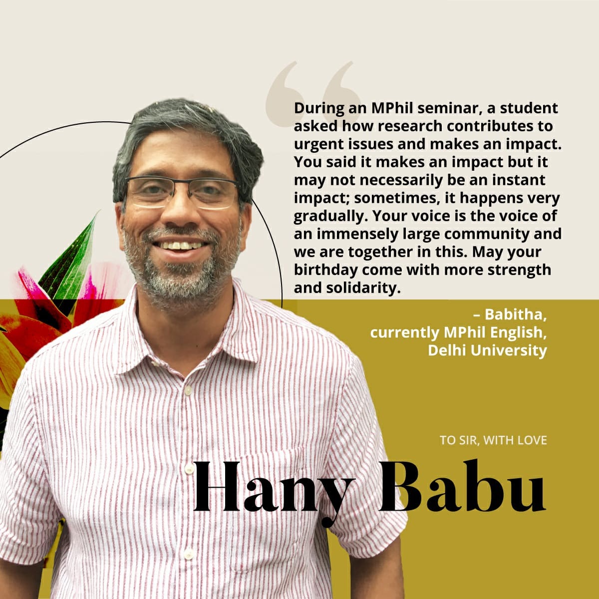 “During an MPhil seminar, a student asked how research contributes to urgent issues and makes an impact. You said it makes an impact but it may not necessarily be an instant impact; sometimes, it happens very gradually. Your voice is the voice of an immensely large community and we are together in this. May your birthday come with more strength and solidarity.”