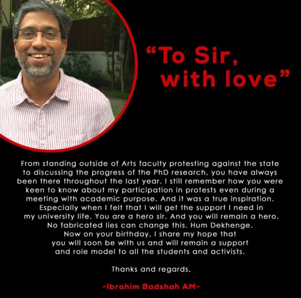 “From standing outside of Arts faculty protesting against the state to discussing the progress of the PhD research, you have always been there throughout the last year. I still remember how you were keen to know about my participation in protests even during a meeting with academic purpose. And it was a true inspiration. Especially when I felt that I will get the support I need in my university life. You are a hero sir. And you will remain a hero. No fabricated lies can change this. Hum Dekhenge. Now on your birthday, I share my hope that you will soon be with us and will remain a support and role model to all the students and activists.”