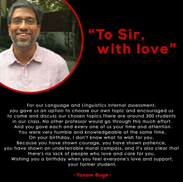 Samiksha, another student wrote in her letter: “Happy Birthday, sir. You have been one of the best professors I have ever come across. Your sincere efforts in a class taught us not just what was in the books but also about the semantics of inclusivity and equality. We take immense pride in being the students of a Professor who speaks up against the wrongs and injustice in our world. We continue to learn from you.”