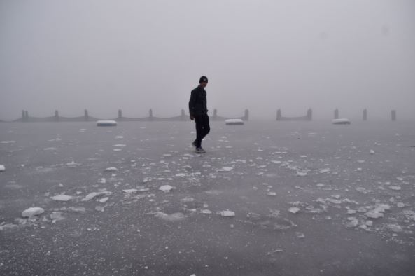 BASIT ZARGAR sends these photos of the Dal Lake, frozen, as residents and tourists step onto the ice for walks and games.