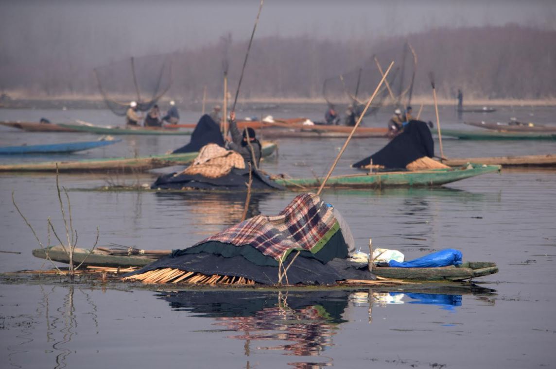 'Tchay-e-gard shikar' (shadow fishing) Kashmiri fishermen covered in torn blankets, hold harpoons as they wait to catch the fish in the Anchar lake in Srinagar. The fishermen camouflage their presence and lure the fish into a trap with the help of reeds and waves by beating the water.