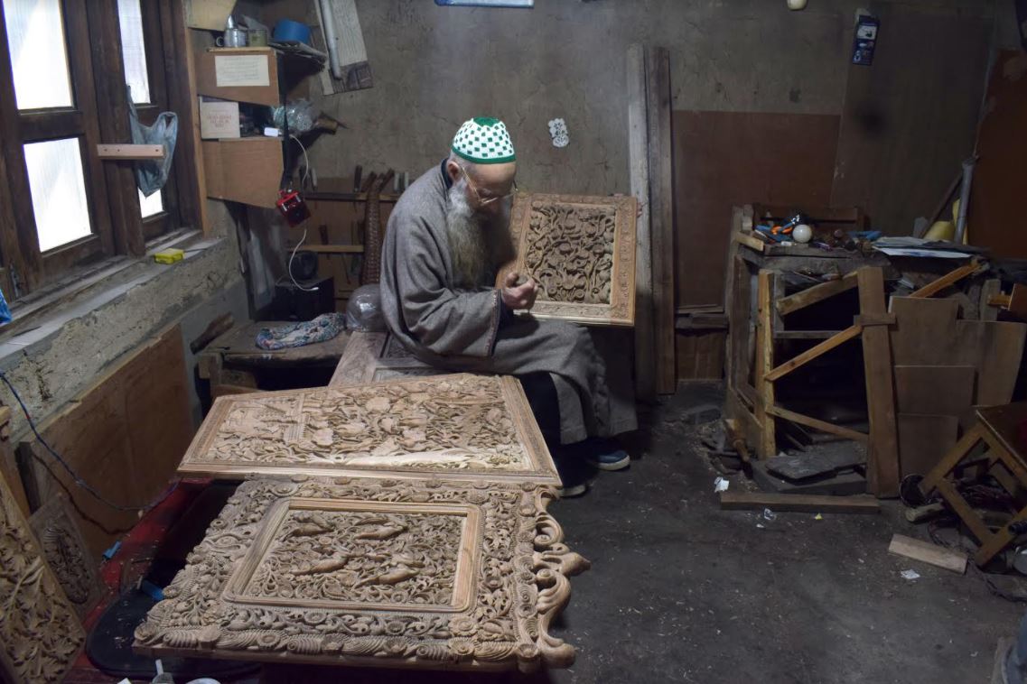 A kashmiri artisan Ghulam Nabir Dar, 67 carves wood at his workshop in downtown Srinagar. Ghulam Nabi Dar is a master craftsman in the art of walnut wood carving.