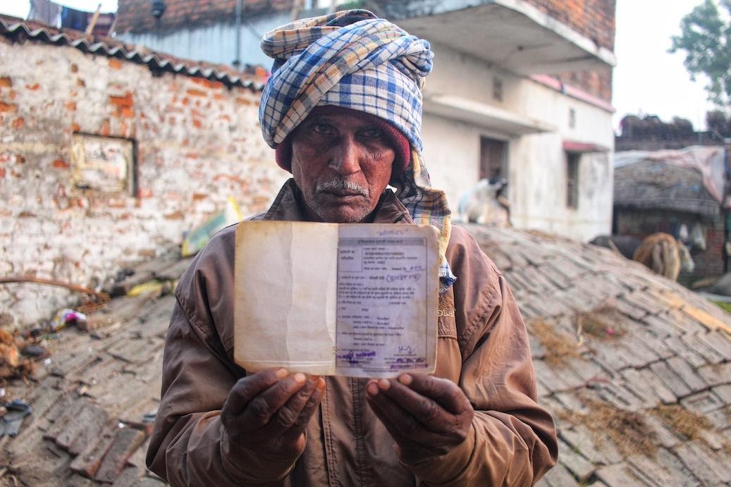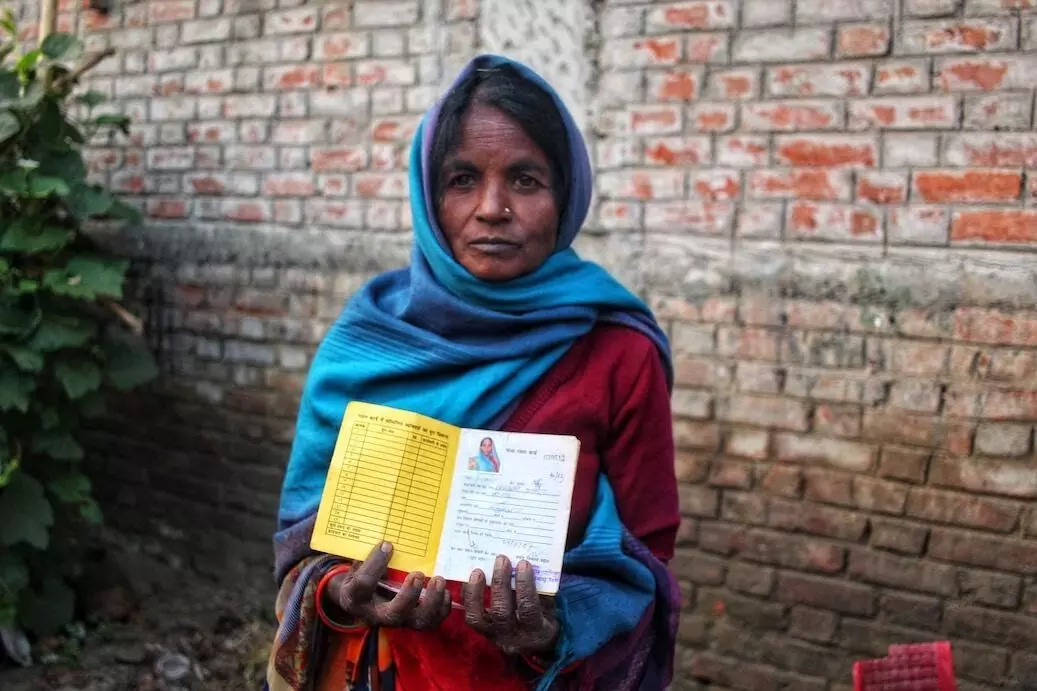 Kalanti Devi, 61 showing her ration card issued in 2019