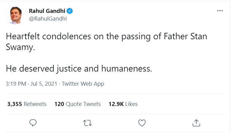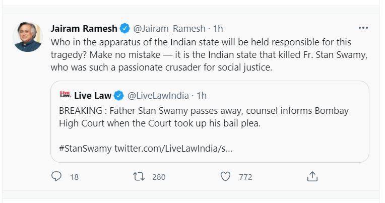 Rajya Sabha Member, Jairam Ramesh tweeted, “Who in the apparatus of the Indian state will be held responsible for this tragedy? Make no mistake — it is the Indian state that killed Fr. Stan Swamy, who was such a passionate crusader for social justice.”