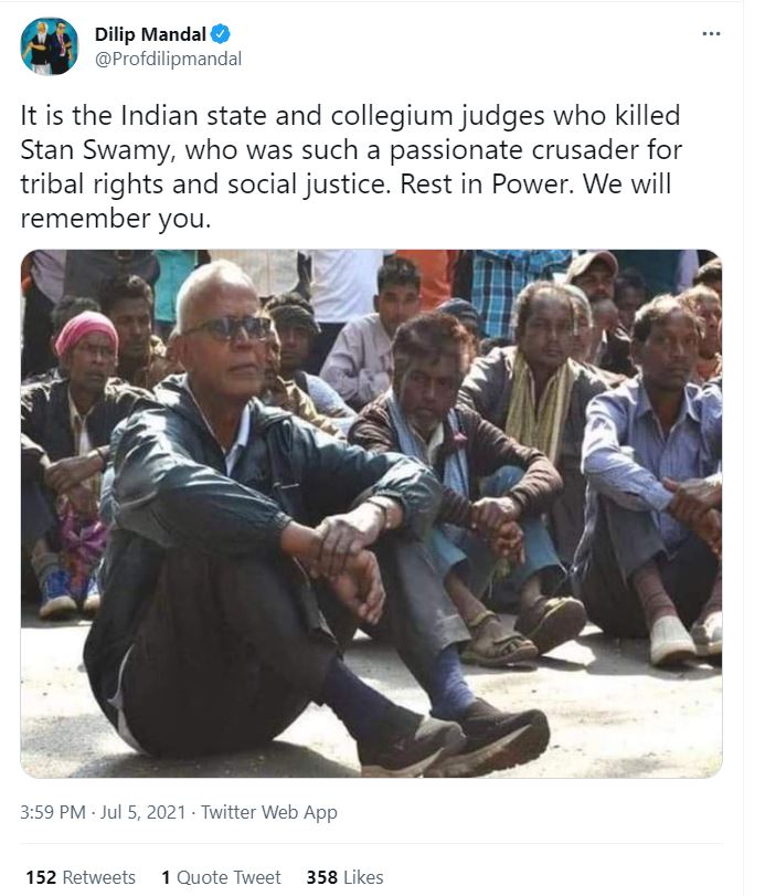 Writer Dilip Mondal wrote, “It is the Indian state and collegium judges who killed Stan Swamy, who was such a passionate crusader for tribal rights and social justice. Rest in Power. We will remember you.”