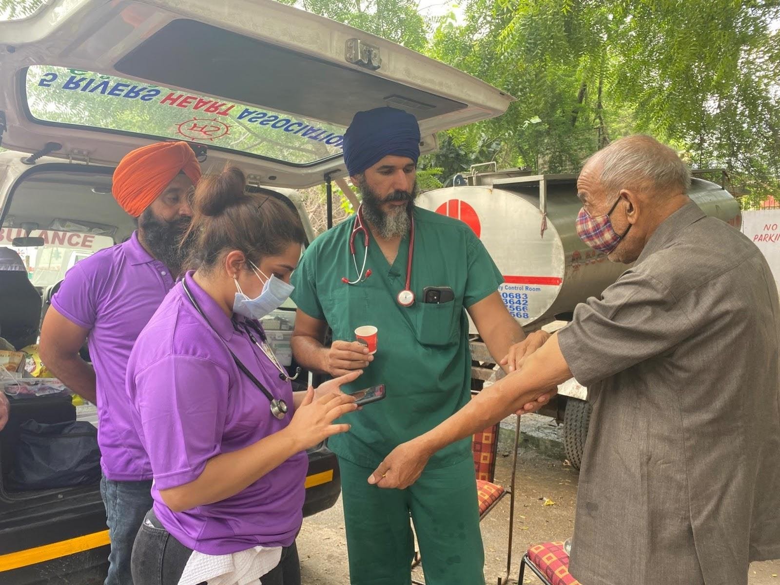 The volunteers, wearing purple “Pind California” t-shirts, accompany the farmers every day from Tikri border and give them free medicines and health checkups.