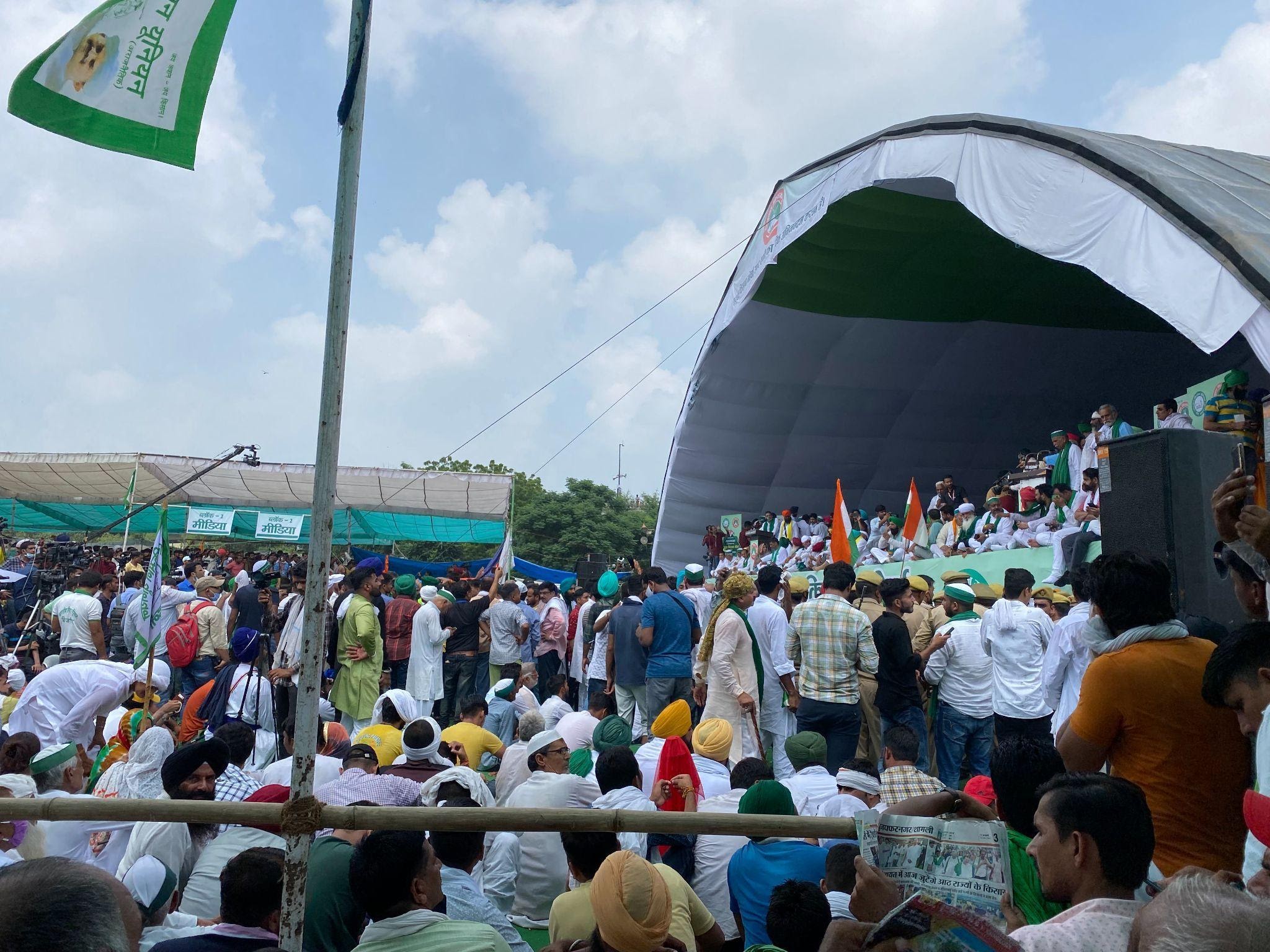 Slogans of “Kisan Ekta Zindabad” can be heard at what has been termed as the biggest farmers rally in India yet. Armed police personnel in large numbers are surrounding the area on all sides, blocking roads and guiding barricades. Amidst heavy policing, Various farm leaders are addressing large crowds as people cheer and clap in support.