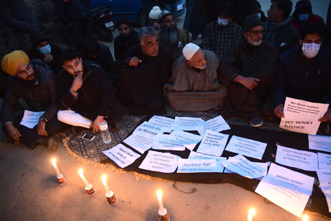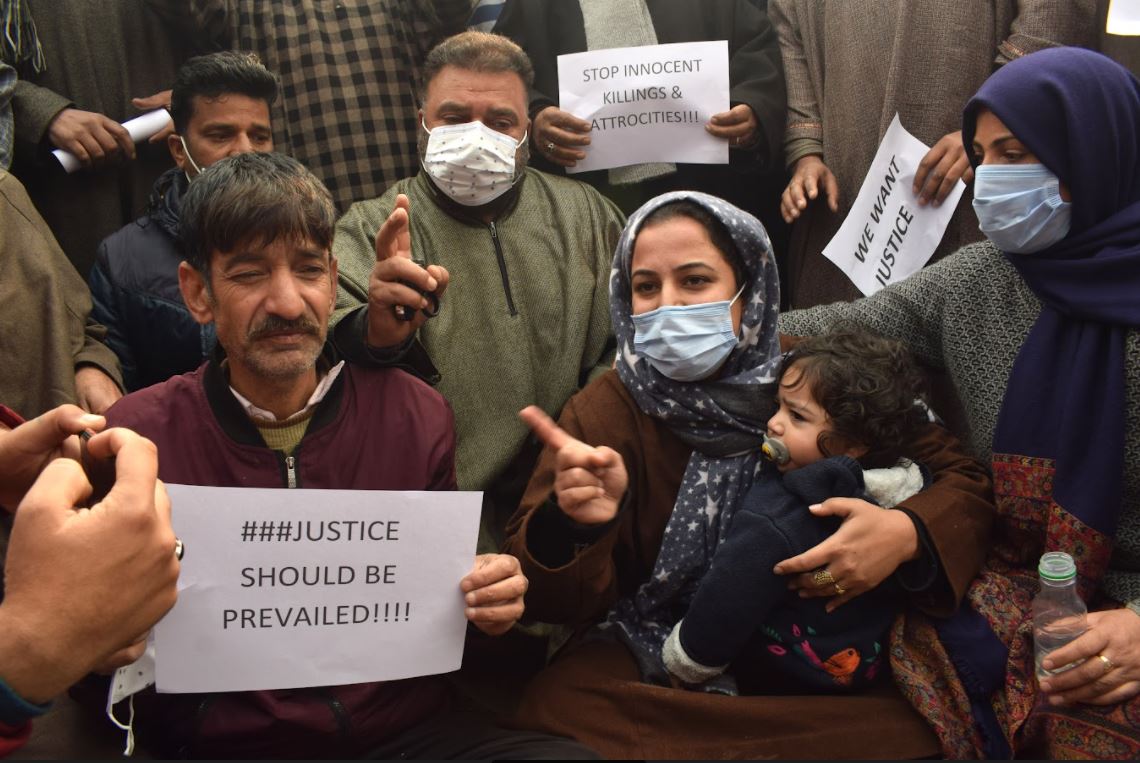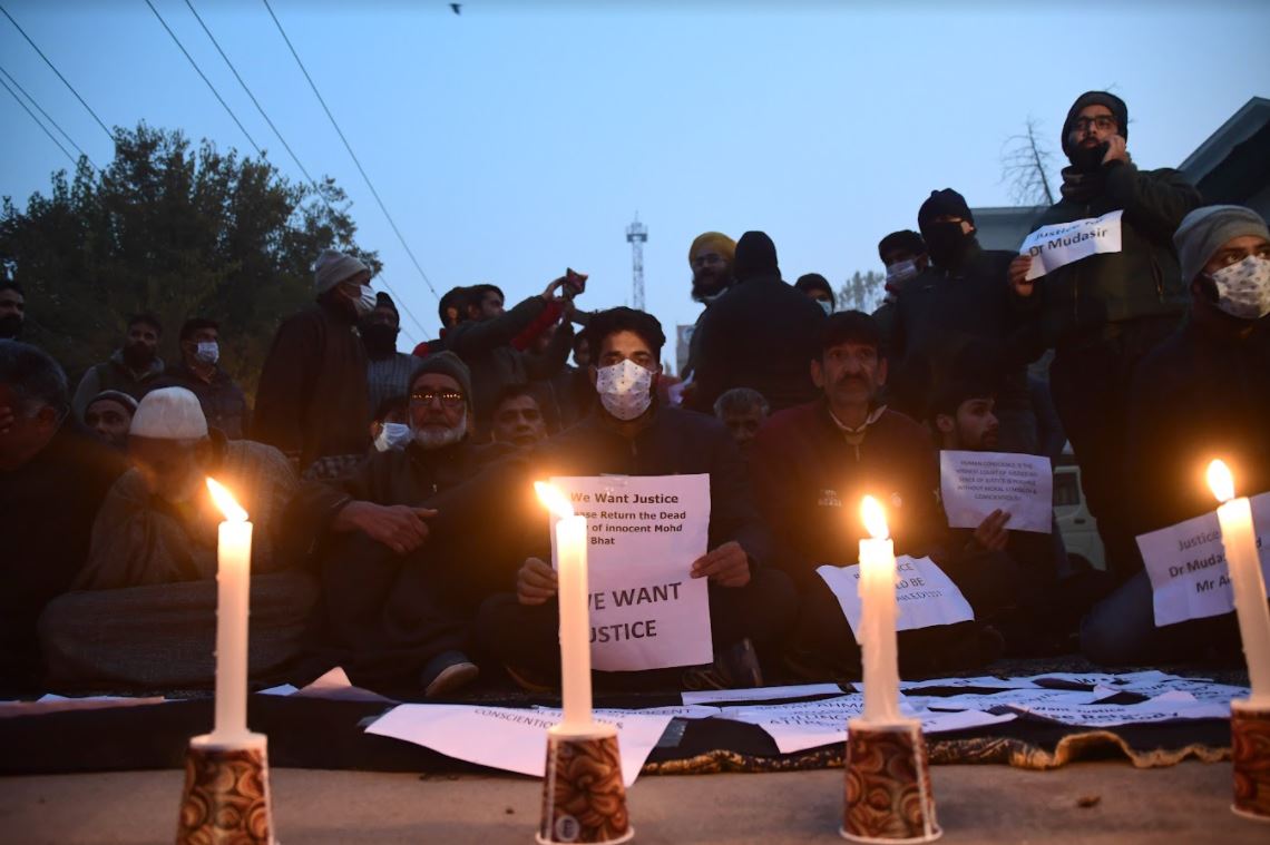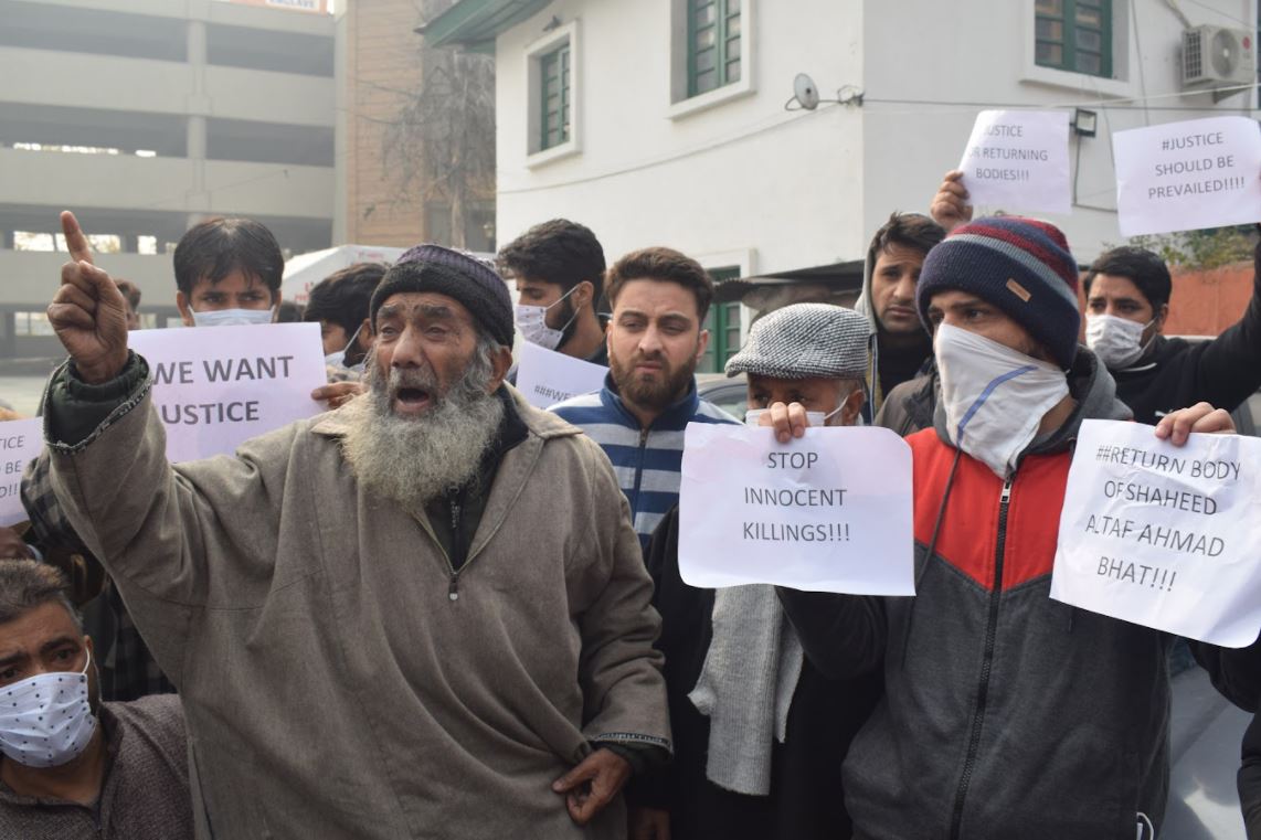 The family of Mudasir Gull contested the police claims and protested at the Press enclave at Srinagar while demanding justice and his body for the last rites.