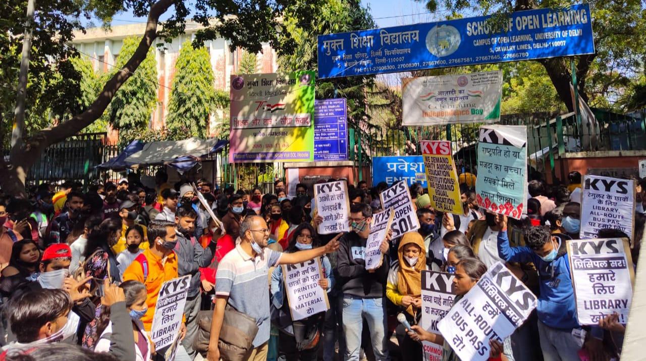 On February 18, members of the Krantikari Yuva Sangathan and other students from the School of Open Learning staged a protest. The students gathered outside the SOL gate to demand a hybrid mode of examination as opposed to compulsory physical exams, the commencement of weekly classes, and the distribution of study material to the students, among other requests.