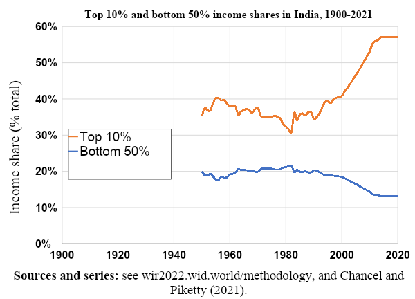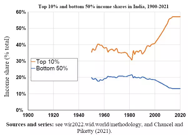 Looking toward a historical perspective (figure below) it is observed that the gaps between the share of the top 10% and the bottom 50% were the lowest between 1950-82, wherein it was 16 points in 1950 and the lowest in 1982 i.e. 9 points. The next lowest contribution by the top 10% was in 1991 (35%) which has further increased in the post reforms period.