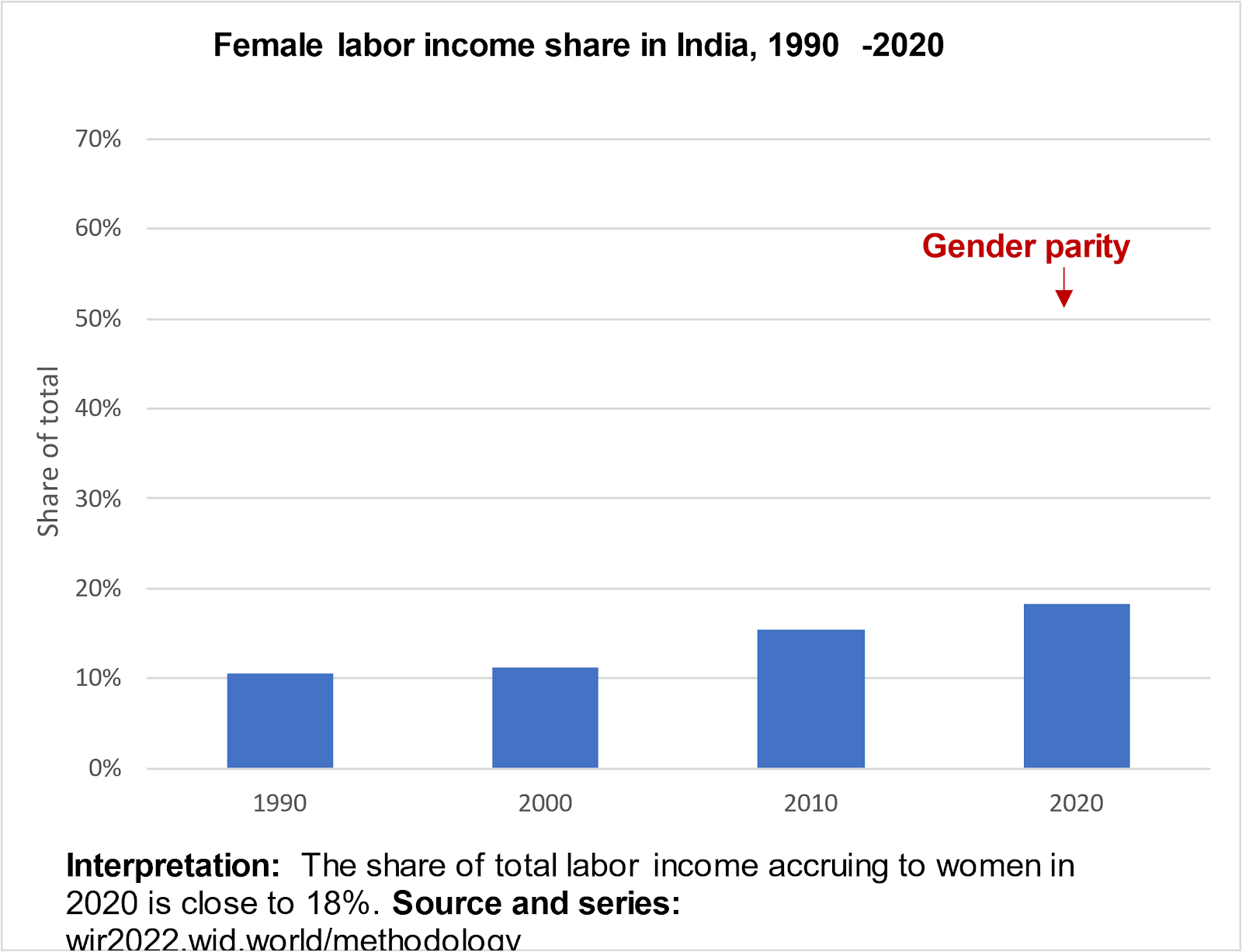The case of gender inequality is even worse as women’s share of labour income totals only 18%, which is lower than the Asian average (excluding China) of 21%. Though historically there has been a significant increase from 10% in 1990 to 18% in 2020, this increment fails to reach the regional average, let alone touching the level of parity of 50% or redress at a level much higher.
