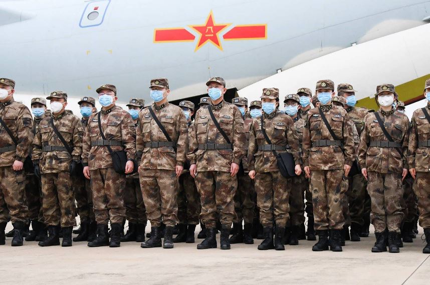 Military medical staff of the People’s Liberation Army arrive at Tianhe International Airport to fight Covid-19 epidemic, Wuhan, Feb. 2, 2020.