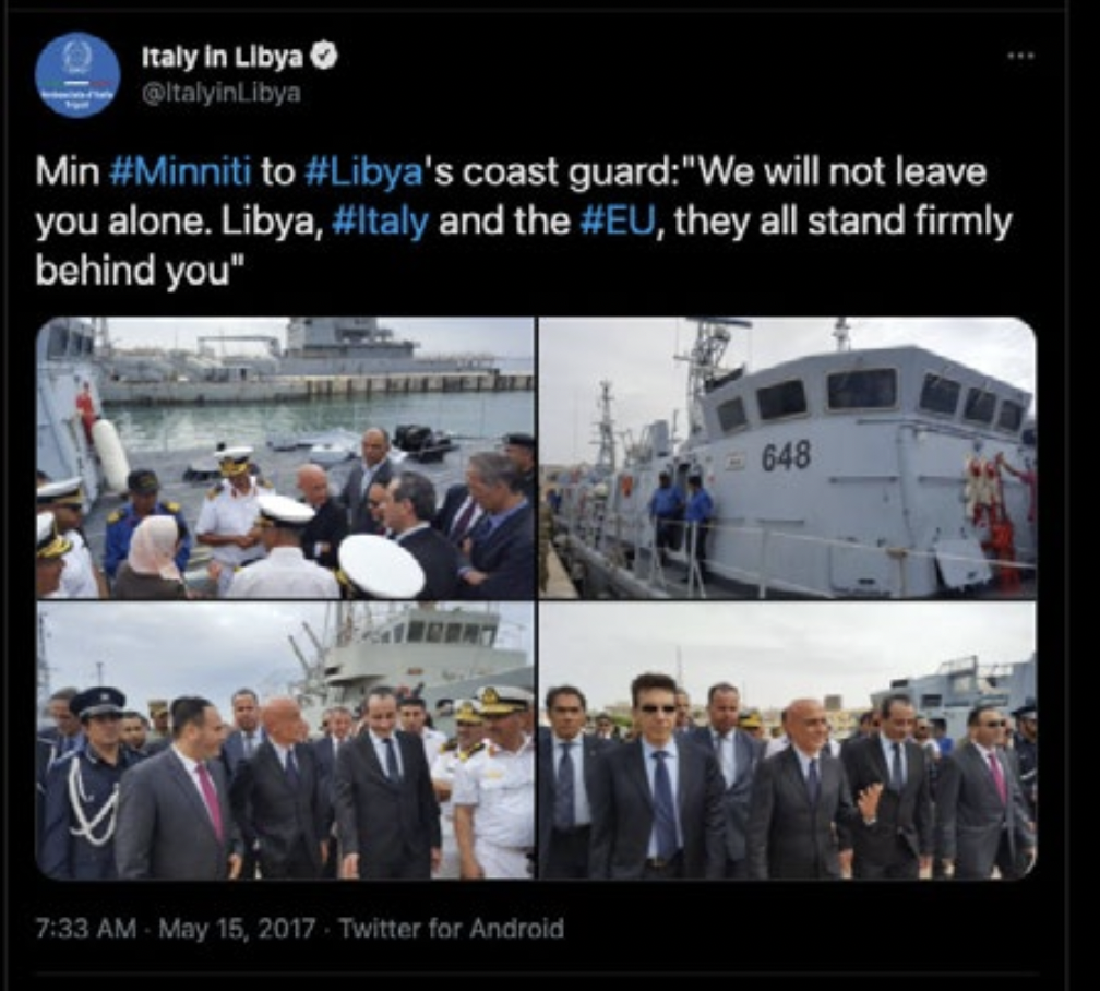 A ceremony in Tripoli in May 2017 attended by Italian home minister Marco Minniti marked the donation of four patrol boats manufactured by Intermarine S.p.A. (headquartered in Sarzana) to the Libyan navy and coast guard. The Italian government had also provided training to some of their officers.