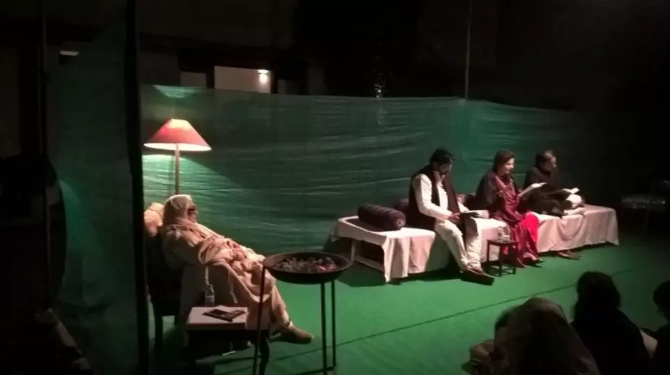 We read our parts during a delicious December evening under a green net enclosure. The light filtered on the form of Krishna Sobti sitting swathed in a shawl her face glowing under the aanchal around her head. She listened to our each word and the reason our articulation touched heights, which we had not thought possible, was because she was our listener.