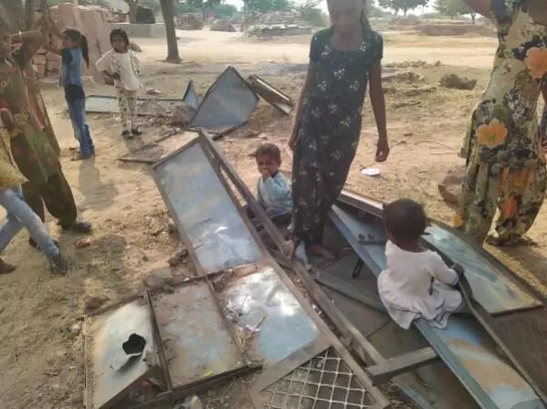 Children play next to a heap of broken bricks and doors in the village of Tausar in Nagaur, Rajasthan. They grew up in homes that were built with these bricks. A court-ordered anti-encroachment drive destroyed their homes in August 2019. Now they battle heat, cold and rain as they struggle to live in tents.