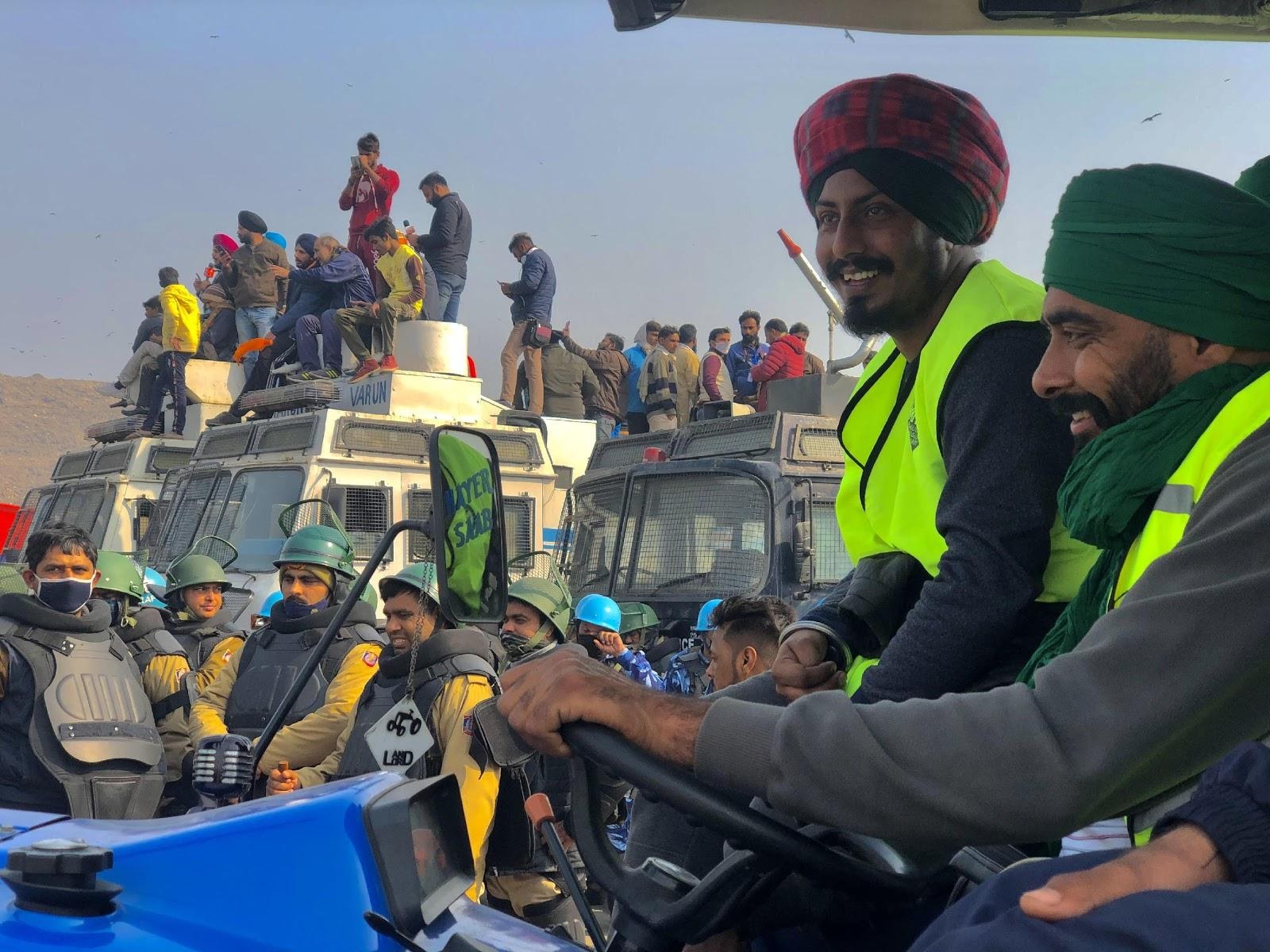 CRPF officers surrounding a tractor at the Singhu border barricades.