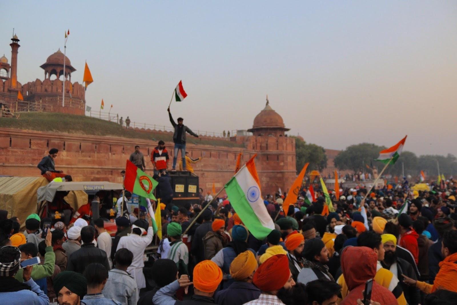 Farmers raising the national flag at Red Fort.