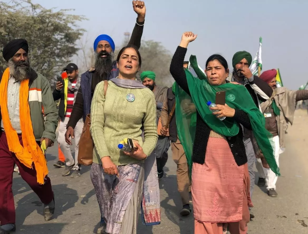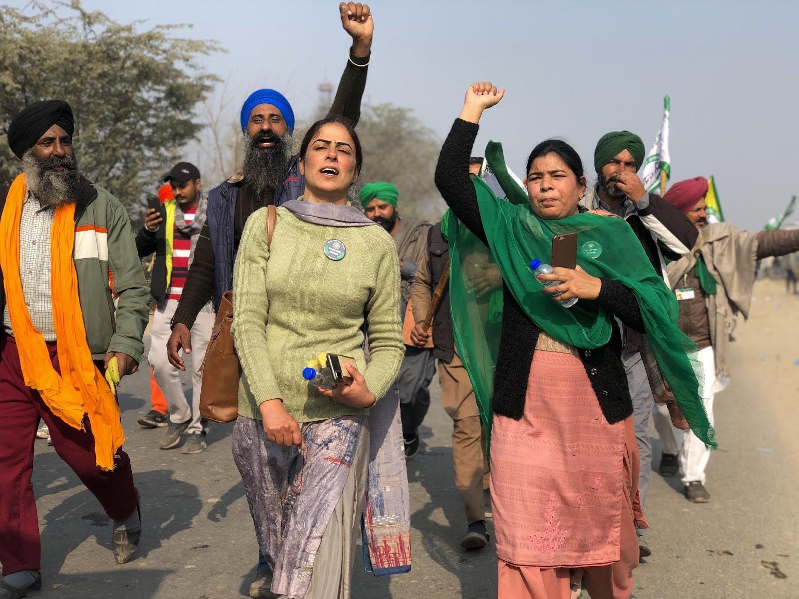 Women protestors marching from Singhu border in the farmer’s tractor rally.