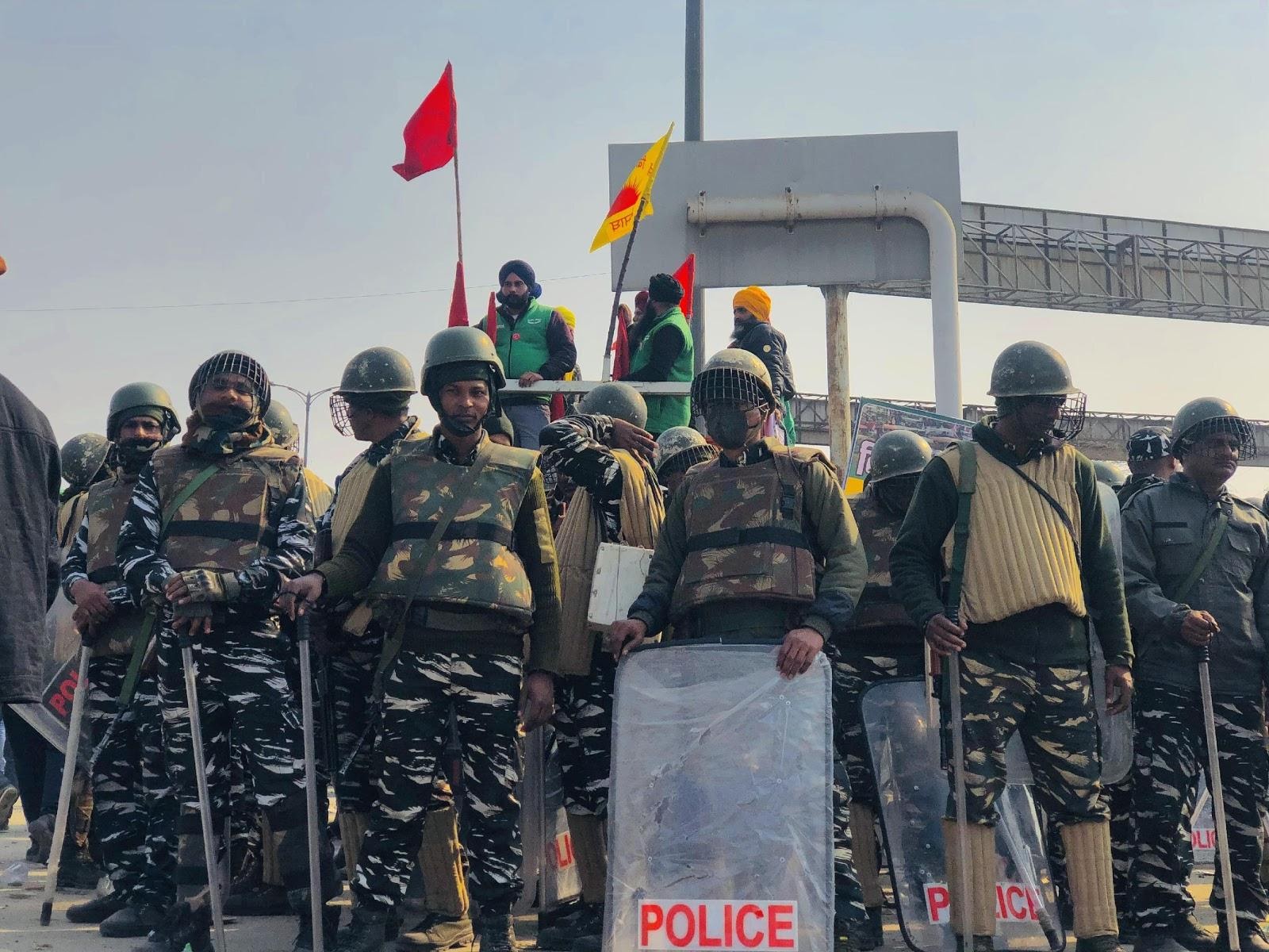 Police personnel and protesting farmers at the Singhu border barricades.