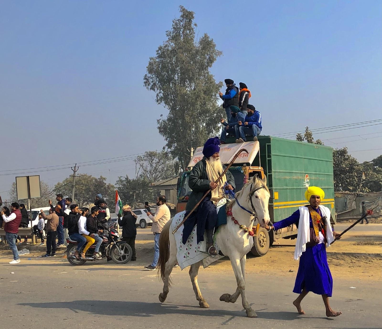 Nihang Sikhs, traditional keepers of horses, joining the tractor march.
