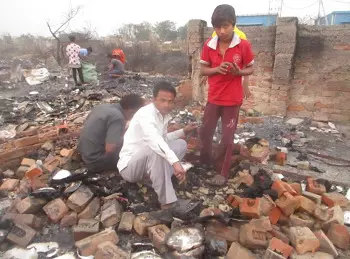 राजेश से बात करके आगे बढ़ा तो देखा कि कुछ लोग जले हुए सामानों को राख के ढेर से इक्ट्ठा कर रहे हैं तो कुछ बोरे में भर रहे हैं। यहां पर चमेली मिली जो कि आठवीं कक्षा में पढ़ती है और दूसरी बस्ती में रहती है वह अपनी दोस्त पायल की मदद करने आई है जो कि खाना लेने गई है। चमेली, पायल के परिवारों वालों के साथ राख के ढेर से जले हुए बर्तनों को इक्ट्ठा कर रही थी जिससे उसको बेच कर कुछ पैसा मिल जाए। इसी तरह से सातवीं में पढ़ने वाले इमरान शेख भी अपने परिवार की मदद कर रहे थे। पायल के पिता अब्दुल बारीक कबाड़ चुनने का काम करते हैं।