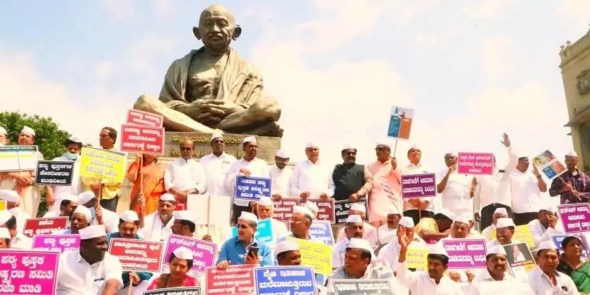 As the controversy over the revision of school textbooks in Karnataka continues to escalate, the Karnataka Congress unit on Thursday staged a protest. Led by D K Shivakumar, President of the Karnataka Pradesh Congress Committee, Siddaramaiah, leader of the opposition in the legislative assembly and several other lawmakers, the protest took place in front of the Mahatma Gandhi statue at Vidhana Soudha.