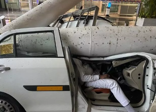 According to news reports, airport director Rajeev Ratna Pandey said the canopy was installed to “beautify the 'drop and go' area”. However, “it ripped under the weight of the water and the water fell with great force on a car parked there."