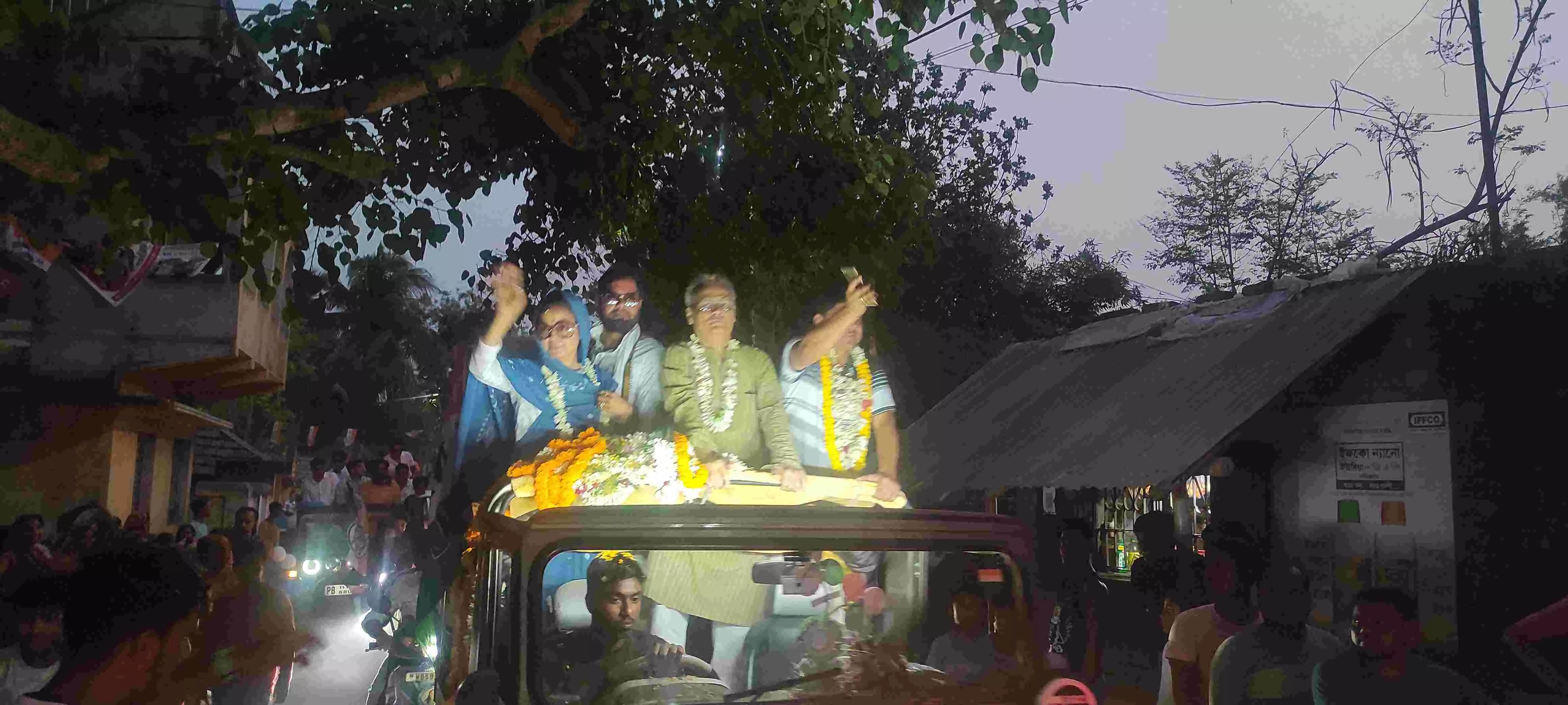 Accompanied by local legislator Rukbanur Rahman, Moitra crisscrossed villages of the Chapra assembly constituency, followed by a nearly-mile-long entourage of motorbikes, through the evening to connect to as many voters as she could.