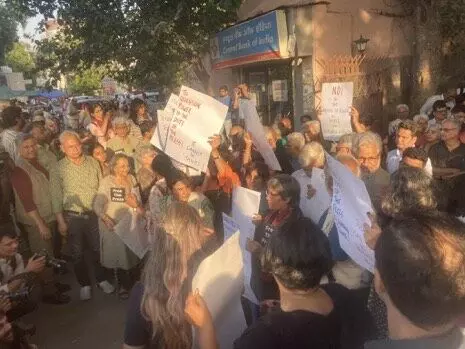 Hundreds of media professionals protested at the Press Club of India in Delhi on October 4, a day after the mayhem when offices of NewsClick, and homes of their staffers and contributors were raided.