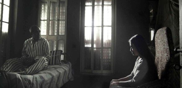 The wall clock shows 9.00 but whether it is morning or night we have no idea, as the lives of these four seem to be trapped within that fixed hour. The actions of the three females are so repetitive every single day that we not only lose track of time, as does the captive doctor, but also get extremely bored as it is difficult to discover why this is happening. The routine remains the same every single day. The doctor wakes up to find the seniormost Mamoni seated on an easy chair knitting something and casting a scary look at him. The younger Mamoni arrives and ties him up before and after meals. The little Mamoni does some drawings in a book and keeps narrating the very same story that appears to have a symbolic relationship with the narrative of the film.