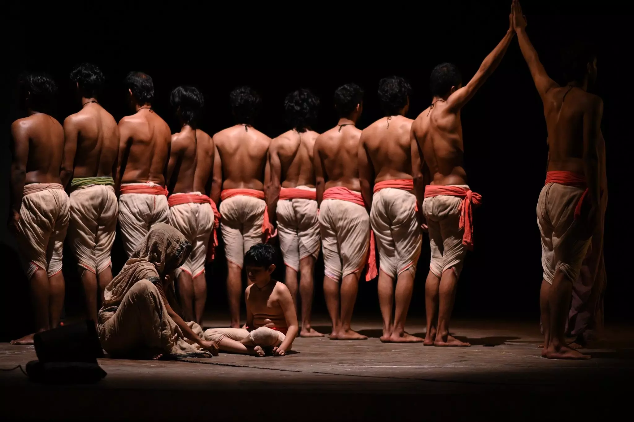The stage is almost without any set or props, because the large cast of people including women and a kid are sad, angry, rebellious and hungry props unto themselves. The large number of ‘low-caste’, poverty-stricken workers are united in their anger and their costumes, a dhoti with a gamcha and bare bodies above perform as if they are performing a ballet in complete harmony and balance, not losing a single step here or a beat there.