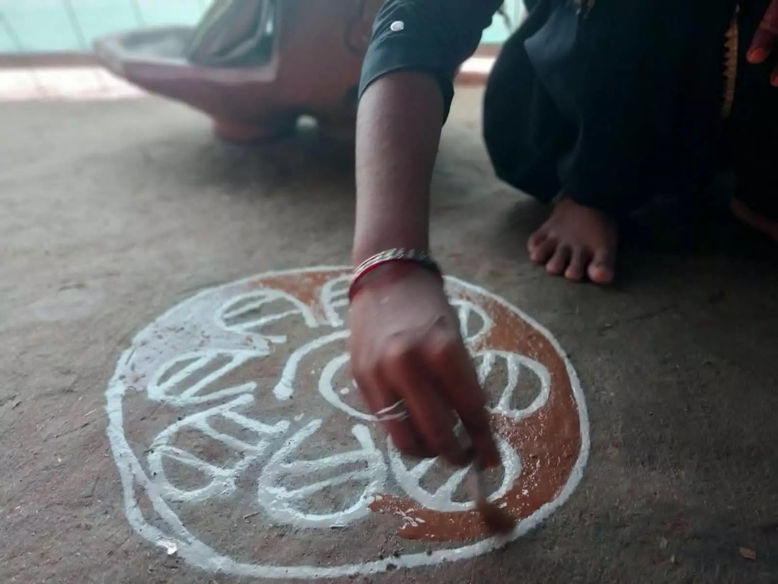 Back home from school, young Shabnam Bano joined me in Bandha. After I requested her to paint a Mandana design, she created a circular one on the floor with a brush.