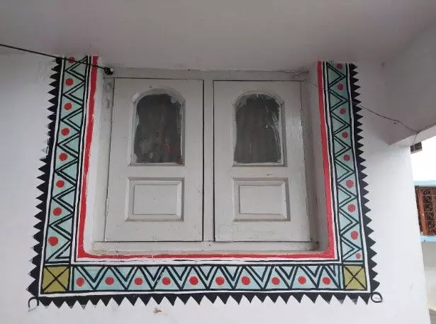 Their borders, often detailed and attractive, are an important part of the art. Their human figures remind me of the style of Warli. These days, acrylics are preferred over natural colours like turmeric for shades of yellow, or mud or soil used for the browns.
