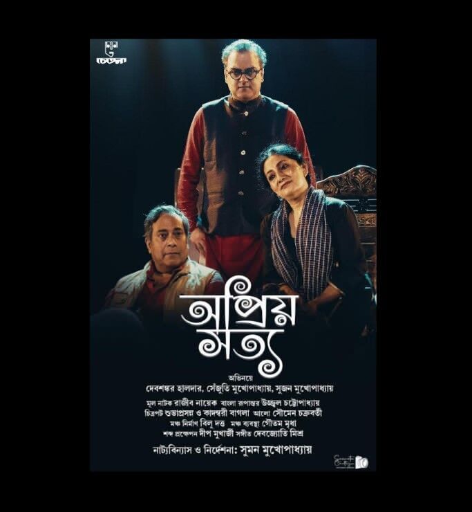 The original play in Marathi titled ‘Sathecha Kay Karaycha’ (What is to be done with Sathe) was authored by the noted playwright Rajiv Naik. The title, translated in Bengali, is called ‘Opriyo Shotto’ meaning, ‘Unpalatable Truths’.