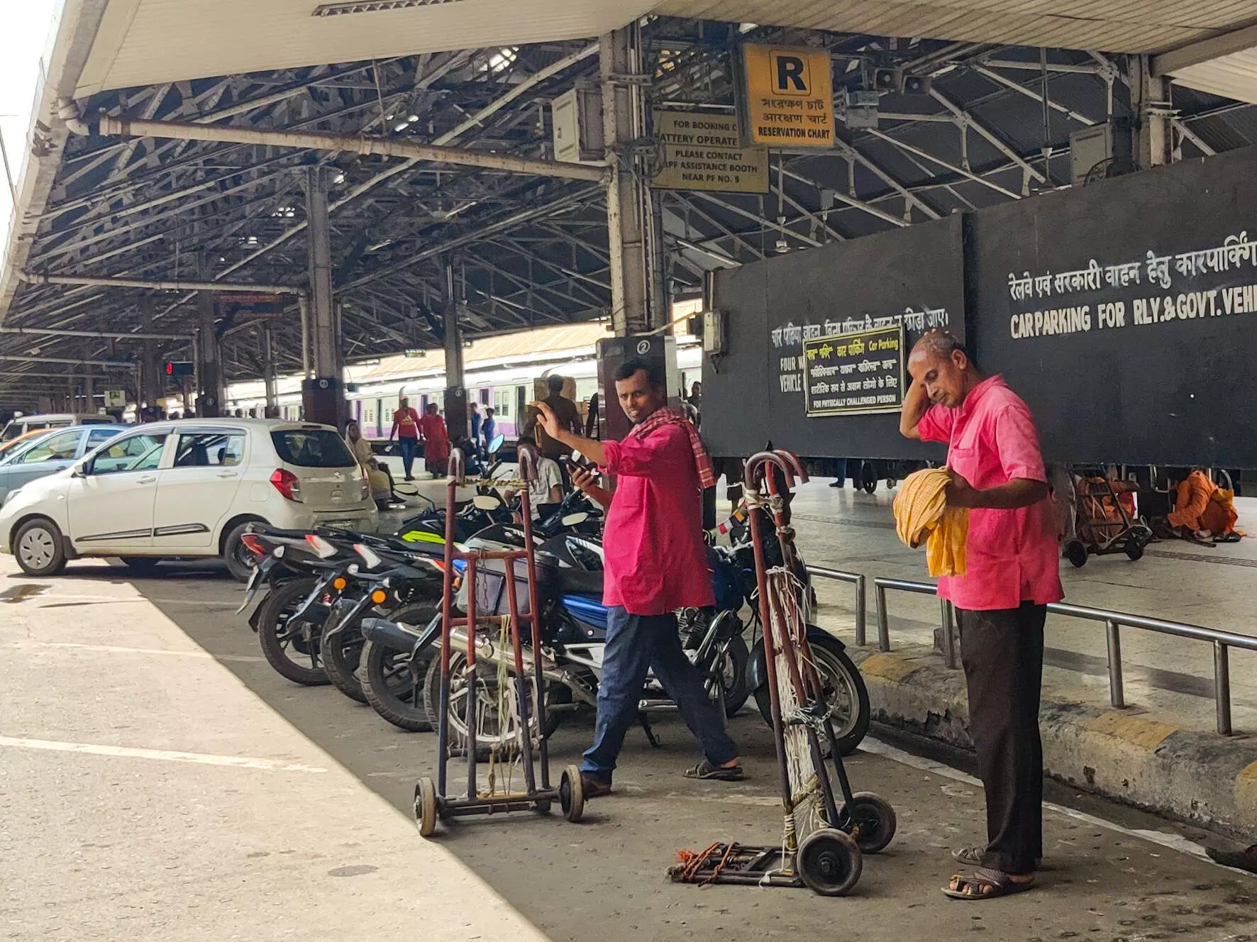 "Jobless and penniless. I come to the station hoping to get work but the trains go by and I spend the entire day sleeping. At night I pull a rickshaw to provide for my family," said Ramakant (34). He works as a full day sahayak also known as a coolie-worker, at Howrah railway junction. He, like the other sahayaks, wears a bright red shirt and copper armband, and his eyes well up with tears when he speaks of his daily struggles.