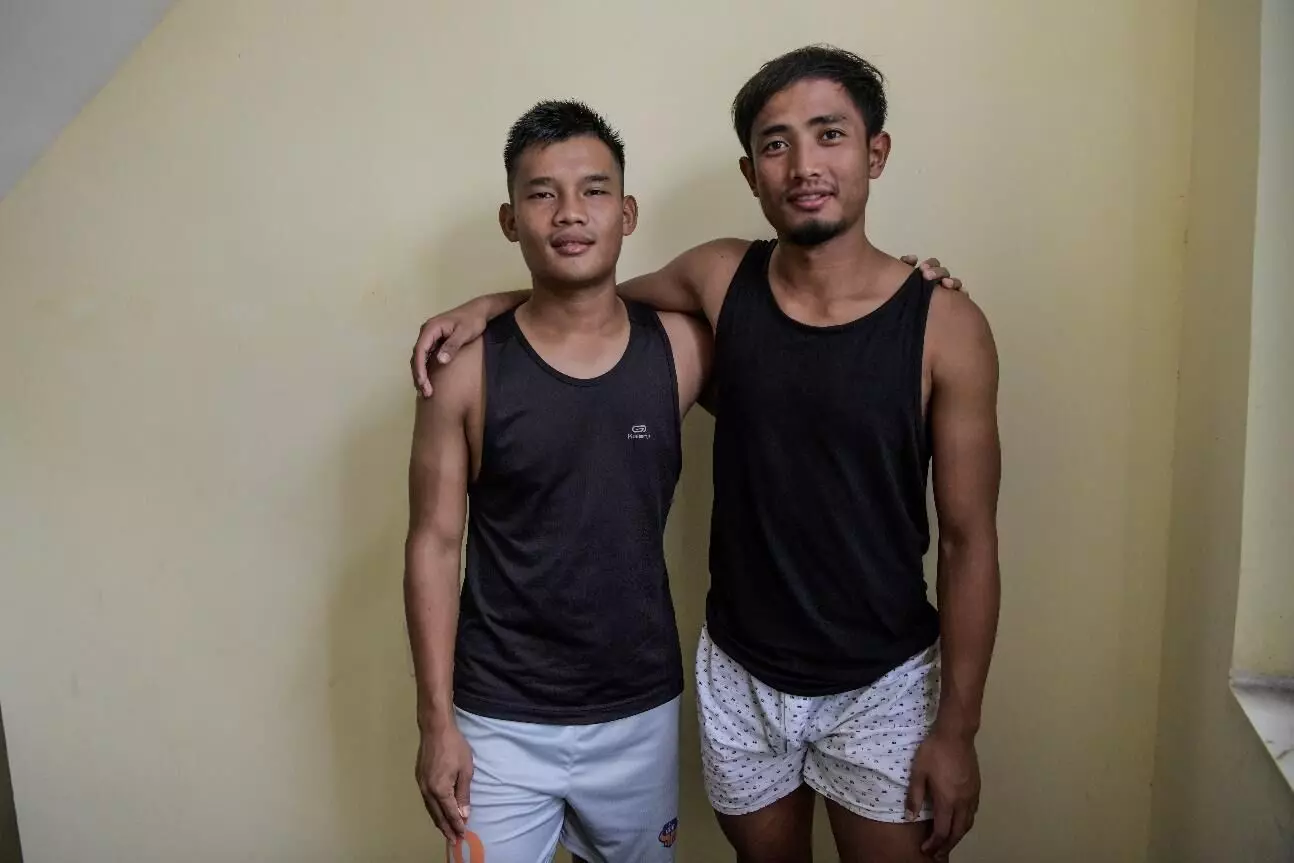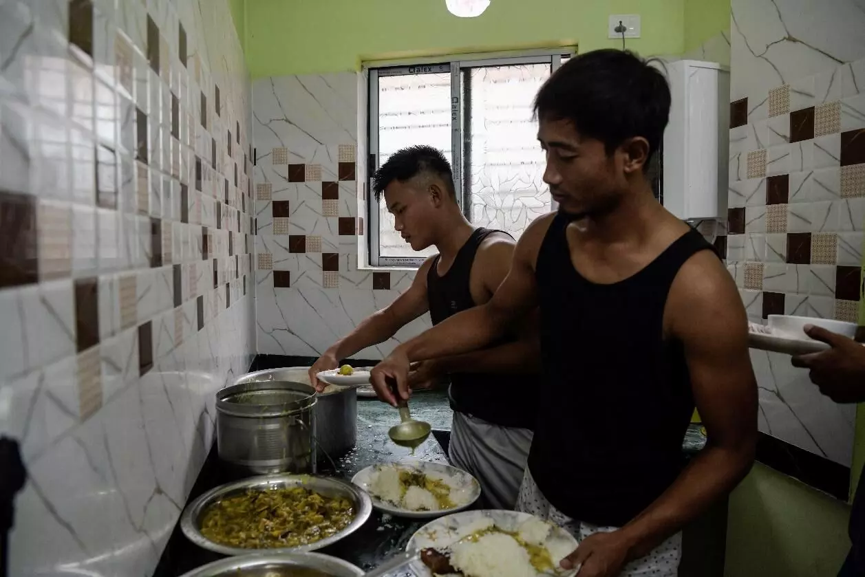 Meitalkeishangbam Roger Khuman (23) a Meitei, and William Lalgoulien Kuki (20) a Kuki, serve themselves lunch in their apartment in Kolkata after returning from practice.