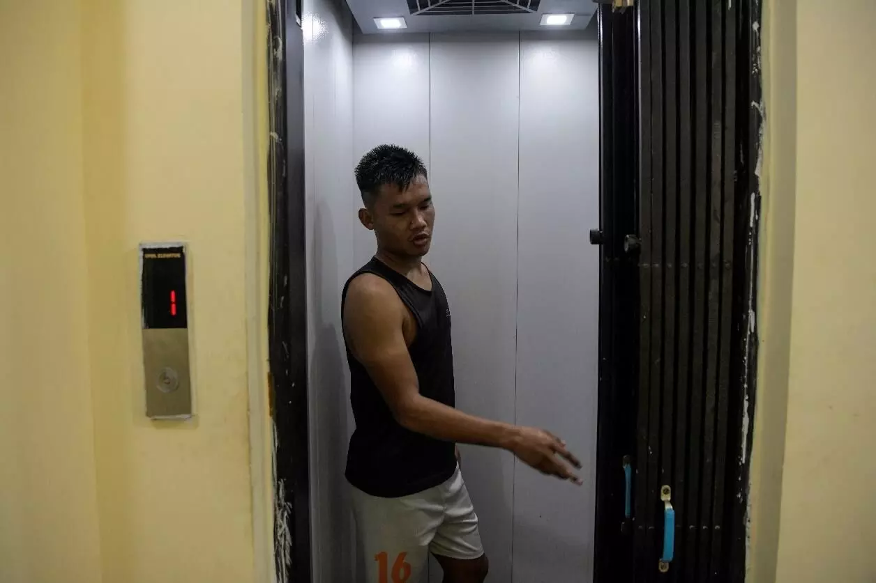 William Lalgoulien Kuki enters a lift to go upstairs and chat with his friend about their next match.