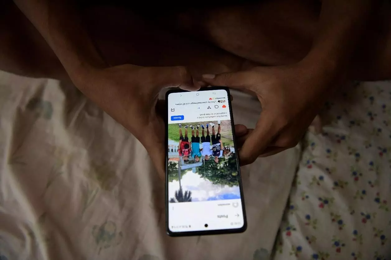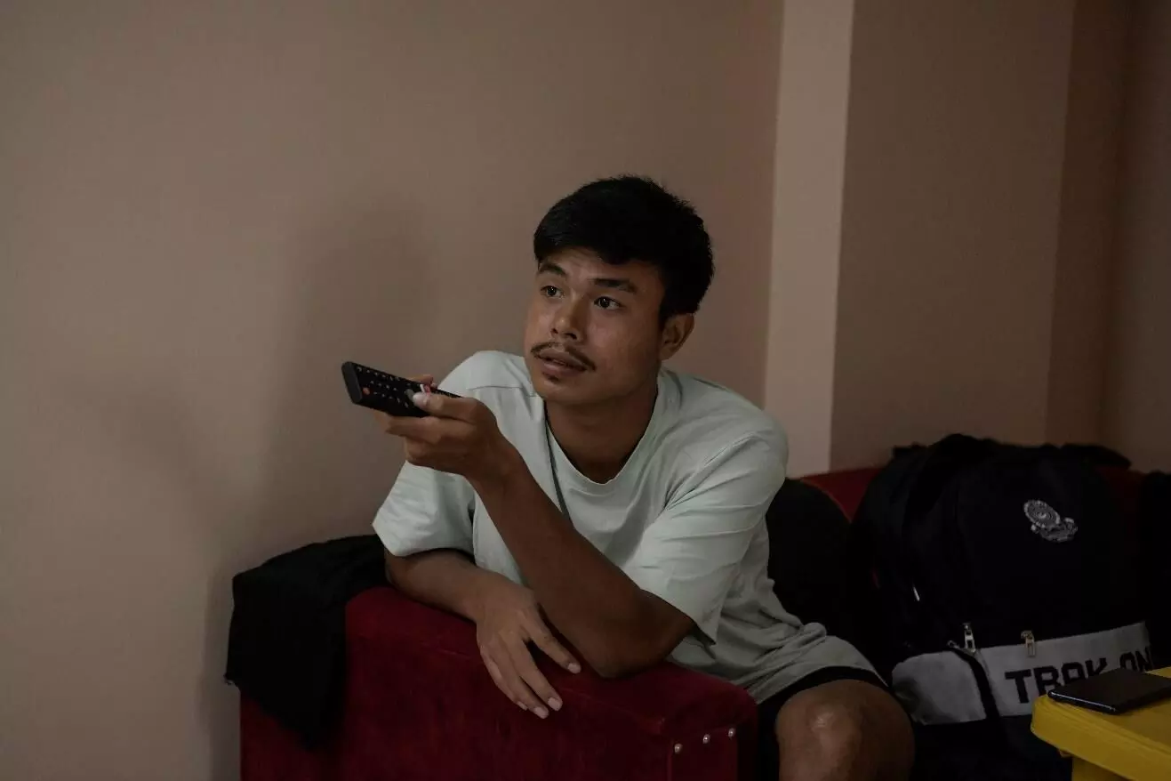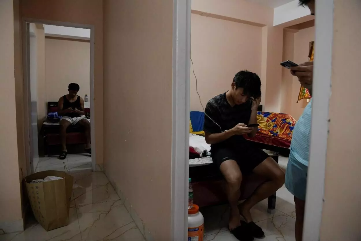 After returning from their practice, Manipuri players browse their phones in their apartment in Kolkata. During their free time, they relax and unwind, some of them spend their time shopping, mostly for sports equipment, while others meet friends from different clubs, who also hail from Manipur.