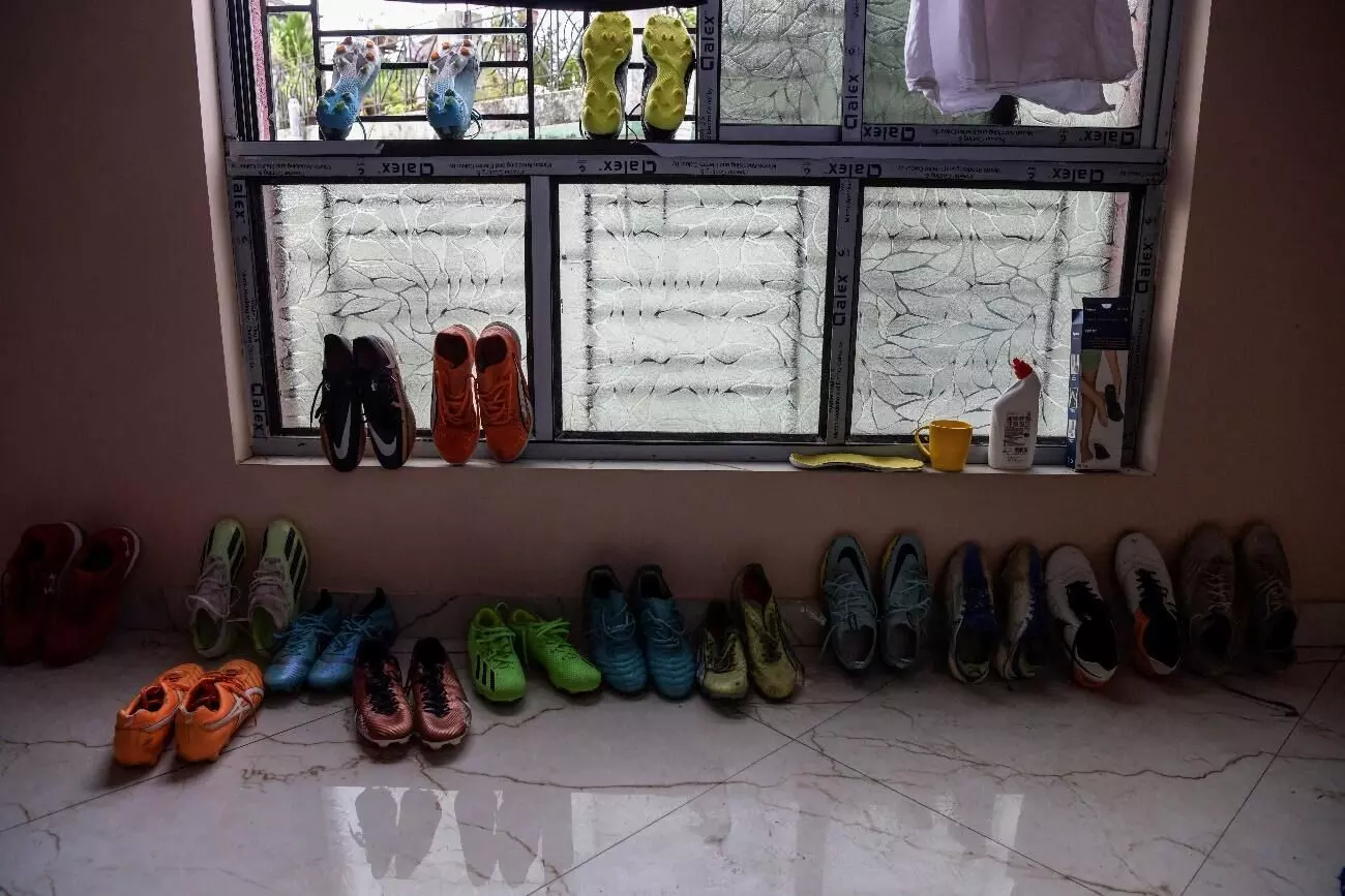After their practice, the Manipuri footballers' boots are lined up to dry. Players from Meitei and Kuki communities stay together in one building. This living arrangement fosters a sense of unity and camaraderie among the players, transcending any differences that might exist between their respective communities. The sight of boots drying on the wall is symbolic of their shared passion for football and their ability to come together as a team, regardless of their backgrounds.