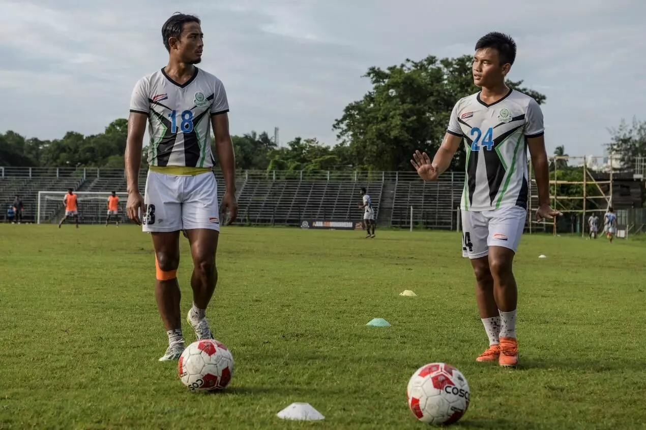 Meitalkeishangbam Roger Khuman (23) a Meitei, and William Lalgoulien Kuki (20) a Kuki community, engaged in a conversation during their practice session at Mohammedan SC's ground.