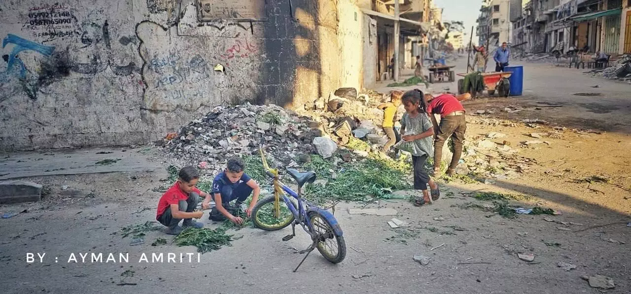 Cover Photograph- Famine and starvation in Gaza. Children pick garbage and streets for leaves to eat. Photograph by AYMAN AMRITI