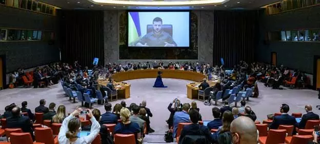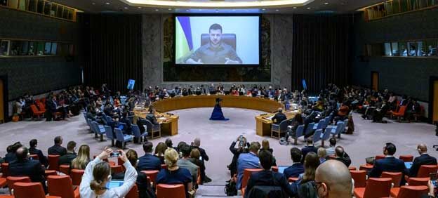 Cover Photograph: President Volodymyr Zelenskyy (on screen) of Ukraine, addresses the Security Council meeting on the situation in Ukraine. "We are dealing with a State that is turning the veto of the United Nations Security Council into the right to die", President Zelynskyy warned. If it continues, countries will rely not on international law or global institutions to ensure security, but rather, on the power of their own arms. April 2022. Credit: UN Photo/Loey Felipe